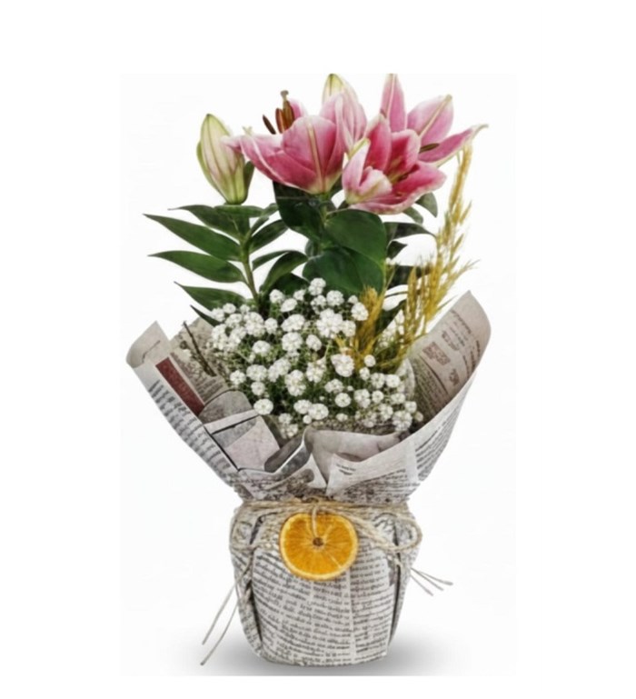 Saksı Yüksekliği: 12 cmSaksı Genişliği: 13,5 cmÜrün Yüksekliği: 45-50 cmÜrün İsmi: gazete Buket Kağıtlı Pembe LilyumHer çiçek güzeldir ama bazı çiçekler çok ama çok özeldir… Zarafetin ve saflığın simgesi olan pembe lilyumlar, sevdiklerinize duyduğunuz sevgiyi ve içtenliği en güzel şekilde ifade etmenin yolunu sunar. Kendine has büyüleyici kokusu ve göz alıcı çiçekleriyle dikkat çeken bu özel aranjman, modern ve şık tasarımıyla her ortamda fark yaratacaktır. Gazete Buket Kağıtlı Pembe Lilyum, hem dekoratif bir dokunuş hem de duygularınızı zarif bir şekilde anlatan özel bir hediyedir. gazete buket kağıdı ile tamamlanan aranjman, yaşam alanlarınıza sıcak bir hava katarken, sevdiklerinize zarif ve anlamlı bir sürpriz yapmanız için mükemmel bir seçimdir. Açık pembe kurdele detayıyla bütünleşen tasarımı ister özel günlerde, ister sıradan bir günü güzelleştirmek için tercih edebilir; pembe lilyumların büyüleyici etkisiyle sevdiklerinizin yüzünde kocaman bir gülümseme oluşturabilirsiniz. Siparişiniz sonrasında çıkacak “Not oluşturma” sayfasında birkaç cümlelik not oluşturarak hediyenizi daha anlamlı bir hale getirmeyi unutmayın.Gönderim Amaçları;Kadınlar GünüSevgililer GünüAnneyeDoğum GünüGeçmiş Olsunİçimden GeldiSevgiliye/EşeTebrikTeşekkür EderimYeni İş/terfiYıl DönümüÖzür DilerimEv Hediyesiİş ArkadaşınaBakım Önerisi:Lilyum bitkisi, bol miktarda parlak ancak dolaylı güneş ışığını tercih etmektedir. Doğrudan güneş yapraklarında yanıklara yol açabilir. Dengeli bir büyüme için bitkinizi belirli aralıklarla çevirerek tüm yapraklarının eşit ışık almasını sağlayabilirsiniz. Sulama konusunda toprağın üst kısmı hafifçe kuruduğunda su vermek yeterlidir. Aşırı sulama kök çürümesine neden olabileceğinden drenajı iyi bir saksı kullanmanız önemlidir. Nem dengesini korumak için yapraklara hafif su püskürtebilir ve çiçeklenme döneminde besin takviyesi yaparak sağlıklı bir gelişim sağlayabilirsiniz.Not: Ürün mevsimsel şartları sebebiyle gonca halinde, kapalı olarak gönderilebilir. Kapalı olan goncalar 1-2 gün içerisinde, oda sıcaklığında açmaktadır.Not: Stok durumuna göre ürünlerde ufak değişiklikler olabilir.