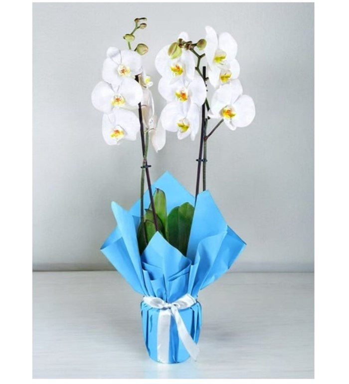 Ürün Yüksekliği: 60 cmÜrün İsmi: Saksıda Beyaz Çiftli OrkideZarafetin ve asaletin en doğal hali olan beyaz orkide, estetik görünümü ve büyüleyici duruşuyla duygularınızı en güzel şekilde ifade etmenize yardımcı olur. Saflığın ve masumiyetin simgesi olan beyaz orkide, sevdiklerinize duyduğunuz derin sevgiyi ve içten duygularınızı anlatmanın en naif yolu olmak için sizi bekliyor. Özel olarak tasarlanmış kraft saksı ve şık kurdele detayıyla buluşan bu eşsiz çiçek, hem doğallığın hem de şıklığın mükemmel bir uyumunu yansıtır. Güzelliği ve zarif duruşuyla göz kamaştıran beyaz çiftli orkide, hem şık hem de anlam dolu bir hediye alternatifidir.İster doğum günlerinde, ister yıldönümlerinde, isterseniz de sıradan bir günü unutulmaz bir ana dönüştürmek için tercih edebilirsiniz. Zarif yapısıyla her ortama uyum sağlayan özel aranjman, sevdiklerinizin yaşam alanlarına huzur ve ferahlık katmanızı da sağlar. Beyaz orkidenin uzun ömürlü yapısı, ona bakan kişiye her gün sizi hatırlatacak eşsiz bir detay sunmaktadır. Sevgi, saygı ve zarafeti bir araya getiren çiçek aranjmanını, sevdiklerinizin yüzünde tatlı bir tebessüm oluşturmak için tercih edebilirsiniz. Siparişiniz sonrasında çıkacak “Not oluşturma” sayfasında birkaç cümlelik not oluşturarak hediyenizi daha anlamlı bir hale getirmeyi unutmayın.Gönderim Amaçları;Kadınlar GünüSevgililer GünüAnneyeDoğum GünüGeçmiş Olsunİçimden GeldiSevgiliye/EşeTebrikTeşekkür EderimYeni İş/terfiYıl DönümüÖzür DilerimEv Hediyesiİş ArkadaşınaBakım Önerisi:Orkideler, aydınlık ortamları sever ancak doğrudan güneş ışığına maruz kaldıklarında yaprakları zarar görebilir. Bu nedenle, bitkinizi doğrudan güneş ışığı almayacak, ancak bol miktarda dolaylı ışık görecek bir yere yerleştirmeniz en iyisidir. Orkidenizi, filtrelenmiş ışık alabileceği bir noktada, perde arkasında konumlandırmak bitkinizin sağlığı için faydalı olacaktır. Sulama konusunda, kireçsiz su kullanarak ve daldırma yöntemiyle sulama yapmak önerilir. Yaz mevsiminde 5 günde bir, kış mevsiminde ise haftada bir sulama yeterli olacaktır. Sulama yaparken, köklerin suya tamamen doyduğundan emin olun ve ardından fazla suyu iyice süzdürerek bitkinizi yerine geri koyun. Bu şekilde doğru bir bakım sağladığınızda, orkideleriniz uzun süre boyunca sağlıklı ve canlı kalacaktır.Not: Stok durumuna göre ürünlerde ufak değişiklikler olabilir.